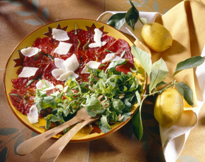 Carpaccio de bœuf sur salade verte et parmesan, frites maison